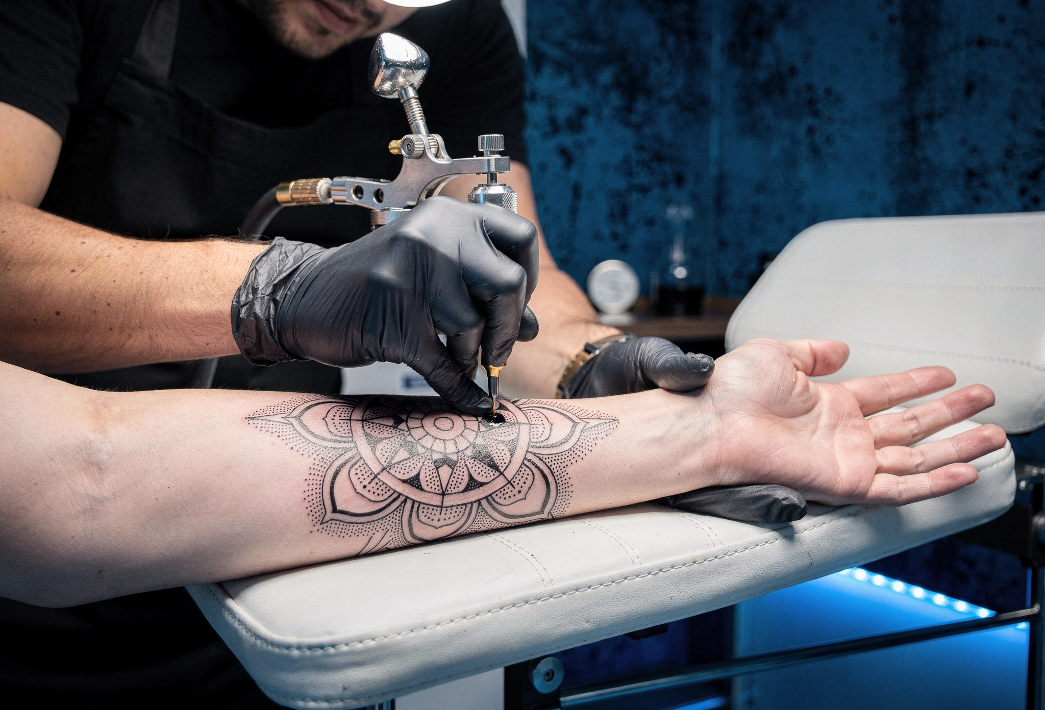 Inkova premium dovme studyosu ic mekan — koyu mavi aydinlatmali profesyonel calisma alani